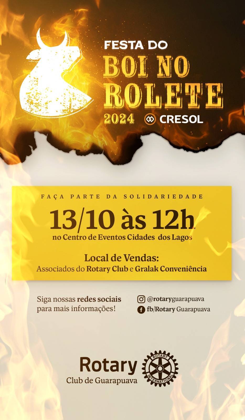 O Rotary Club de Guarapuava tem o prazer de convidar todos para a nossa tradicional Festa do Boi no Rolete! Data: 13 de outubro de 2024 Local: Centro de Eventos na Cidade dos Lagos Horário: Início às 12 horas Venha desfrutar de um delicioso Boi no Rolete, preparado com todo o carinho e tradição, além de muita música, jogos, sorteios e atividades para toda a família. Será um dia de confraternização e alegria, onde teremos a oportunidade de nos reunir e celebrar juntos. Toda a renda arrecadada será destinada a projetos e causas humanitárias apoiadas pelo Rotary Club de Guarapuava. Contamos com a sua presença para tornar este evento ainda mais especial. Sua participação é fundamental para continuarmos fazendo a diferença em nossa comunidade. Esperamos vê-lo lá! Atenciosamente, Rotary Club de Guarapuava