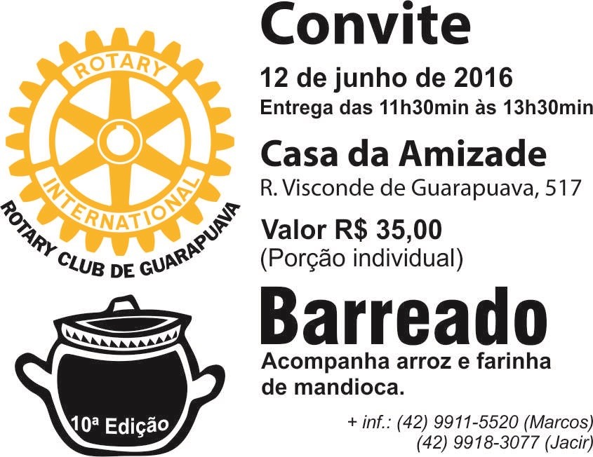 O Rotary Club de Guarapuava, promove a 10ª Edição do Barreado, prato típico do litoral paranaense. Este ano o Barreado será feito através de marmitex especial, onde você poderá levar para a casa. Acompanha Arroz e Farinha de Mandioca. A porção individual está sendo vendida pelos rotarianos ao custo de R$ 35,00. A renda será em prol dos projetos humanitários do Rotary, em especial para o combate a Poliomielite (paralisia infantil).
