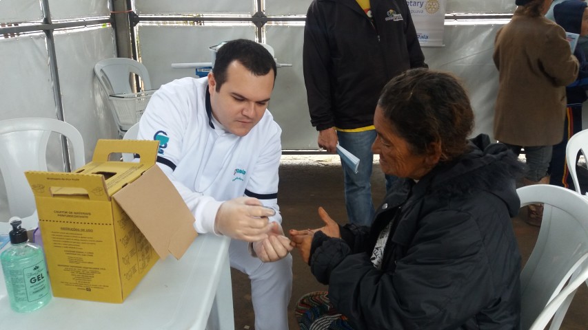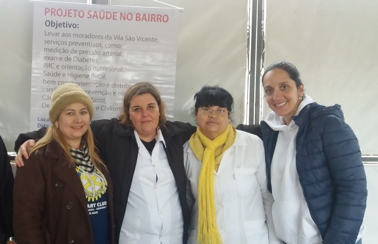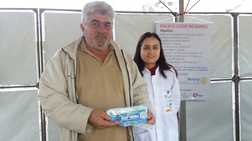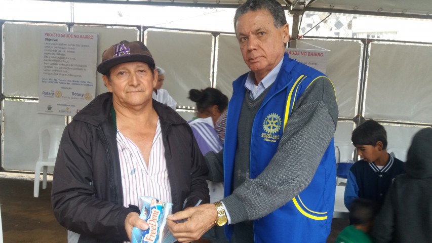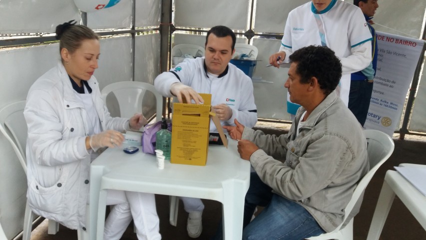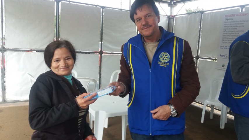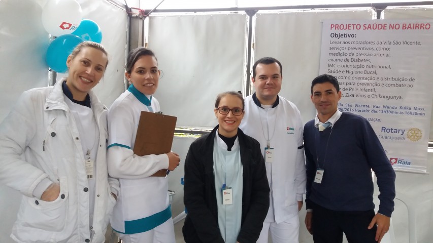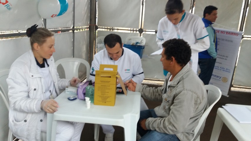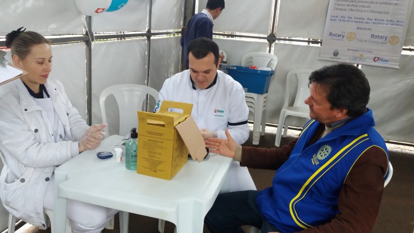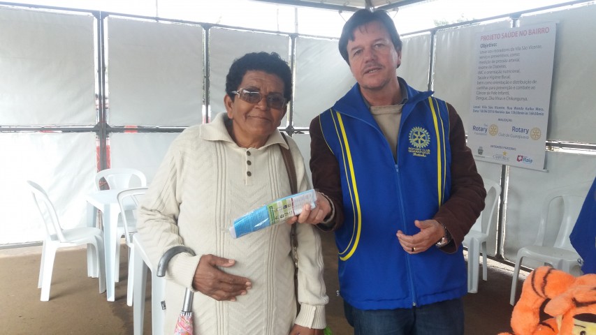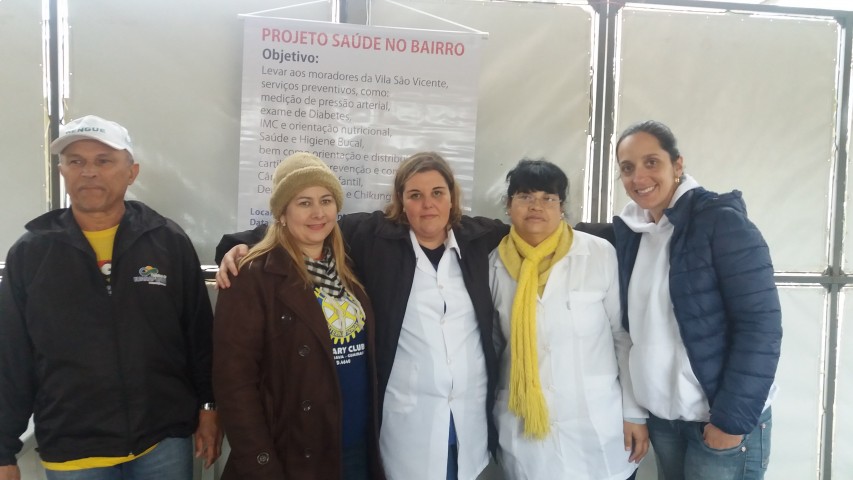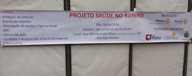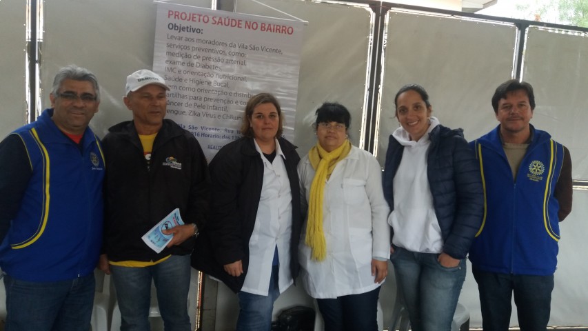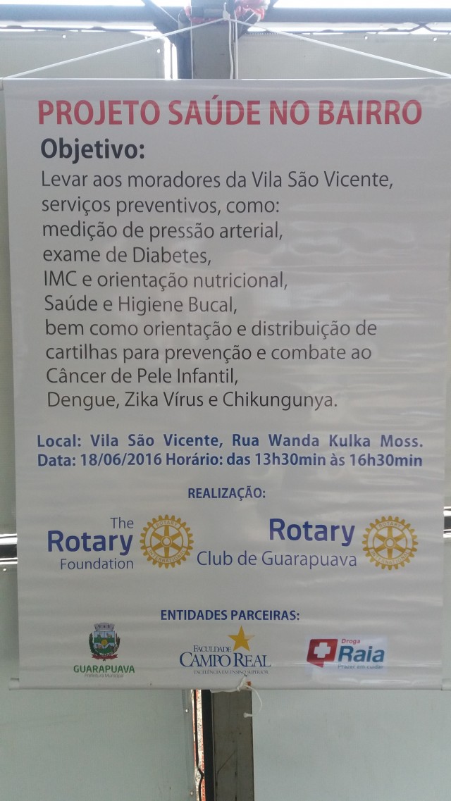 O projeto Saúde no Bairro, através de subsídio Distrital da Fundação Rotária, foi realizado pelo Rotary Club de Guarapuava no último sábado(18/06), na Vila São Vicente com o objetivo de levar os seguintes serviços a comunidade: medição de pressão arterial, exames de diabetes, IMC e orientação nutricional, saúde e higiene bucal, orientação no combate ao câncer de pele infantil e combate a Dengue. O projeto contou com a parceria das seguintes entidades: Prefeitura de Guarapuava/Secretaria Municipal de Saúde e Guaratran, Faculdade Campo Real e Farmácias Droga Raia. Além dos profissionais de saúde teve a participação dos companheiros rotarianos, que ajudaram na organização e orientação e distribuição das cartilhas do projeto. Segundo o Presidente Jacir Queirós, gestão 2015/2016, esse foi um projeto piloto, que deverá ser estendido aos demais bairros carentes de Guarapuava.