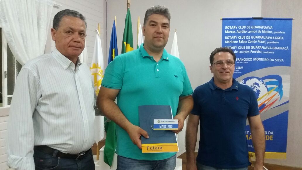 O mais novo associado do Rotary Club de Guarapuava, companheiro Marciano Kloster que foi empossado na visita do Governador Oscar e esposa Vanda, recebeu na última reunião dia 19.10 das mãos do companheiro Hirand e do Presidente Marcos Aurélio Lemos Mattos, a placa de identificação e pasta do Rotary.