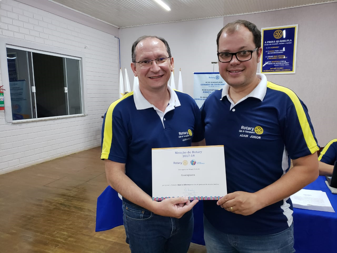 O presidente do Rotary Club de Guarapuava no ano rotário 2017-2018 o sr. Adair Mendes Junior recebeu das mão do atual presidente no ano rotário 2018-2019 o sr. Leonardo da Costa Santini o centificado de Menção do Rotary 2017-2018. Parabéns ao presidente Adair, a sua diretoria e a todos os companheiros que "Fizeram a Diferença" e continuam "Sendo a Inspiração.