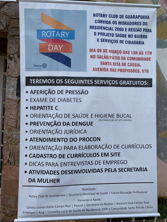Foi um grande sucesso o Projeto Saúde no Bairro e Serviços de Cidadania em conjunto com o Rotary Day realizado no dia 09/03/2019 no Conjunto Residencial 2000 em Guarapuava. Dentre os serviços realizado estão: aferição de pressão, exames de diabetes, teste da hepatite C, orientação de saúde e higiene bucal, prevenção da dengue, orientação jurídica, atendimento do Procon, orientação para elaboração de currículos, dicas para entrevista de empregos, orientações da Secretaria da Mulher, distribuição de brindes diversos, pipoca, cama elástica, pinturas na face e slime, dentre outras atividades.
